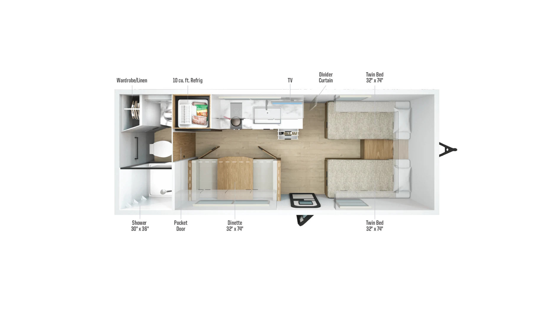 The standout feature of the 2000TRB is its twin bed layout — two beds at the front of the trailer, separated by a nightstand and a privacy divider curtain. Whether you're traveling with a friend, a sibling, or a fellow adventurer, you each get your own sleeping space without sacrificing comfort or style. A spacious dinette rounding out the interior gives you a relaxing spot to dine, play cards, or just decompress after a long day on the road.