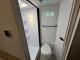 The rear bathroom keeps the living area open and uncluttered. Step in to find a full shower with a generous 14" x 22" skylight overhead, a porcelain toilet, and a roof vent — clean, functional, and easy to use after a day outdoors.